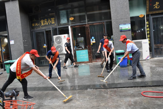 二、“全城清潔”行動(dòng)。清潔家園,黨員志愿者義不容辭。日前,市建投聯(lián)合商務(wù)社區積極響應“全城清潔”行動(dòng)號召,定期組織志愿者對社區單位公共區域、沿街商戶(hù)門(mén)店等內外環(huán)境進(jìn)行集中整治。7月14日下午,市建投黨員志愿者分赴中國人保大廈對沿街商戶(hù)門(mén)店和街道進(jìn)行集中清理。大清掃活動(dòng)采取包干打掃、分頭行動(dòng)的方式,集中對沿街商鋪門(mén)店垃圾桶(池)、地面污漬等進(jìn)行清洗,全面清理整治各類(lèi)衛生死角,清理積存垃圾,杜絕垃圾亂堆亂放。烈日炎炎,市建投黨員志愿者們絲毫不懼37度的高溫,頭戴小紅帽,戴著(zhù)紅袖標,以高度的敬業(yè)態(tài)度和為人民服務(wù)的無(wú)比熱情,全身心投入到環(huán)境衛生清理中,通過(guò)2個(gè)小時(shí)的辛苦勞動(dòng),使人保大廈沿街門(mén)店商鋪和街道面貌煥然一新。