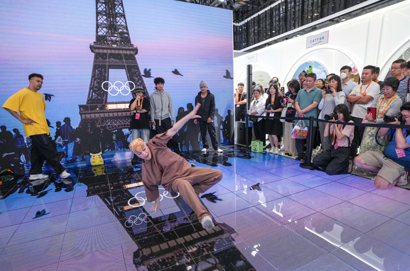 2024年9月14日,在2024年服貿會(huì )國家會(huì )議中心綜合展區的主賓國法國展臺,中法兩國街舞好手在表演霹靂舞。新華社記者 陳曄華 攝