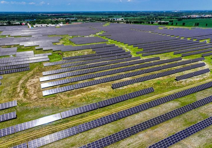 2024年7月19日拍攝的內蒙古通遼發(fā)電總廠(chǎng)光伏電站(無(wú)人機照片)。新華社記者 連振 攝