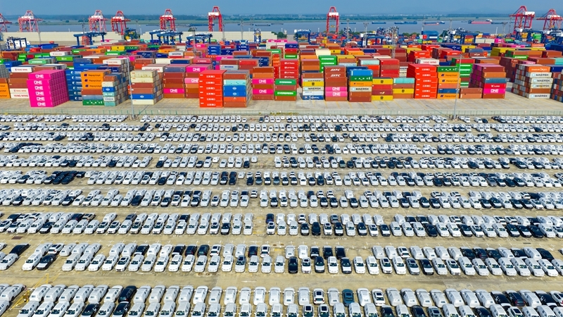 2025年10月4日在江蘇省港口集團南京港龍潭港區拍攝的準備裝船出口的汽車(chē)(無(wú)人機照片)。新華社發(fā)(楊素平?攝)